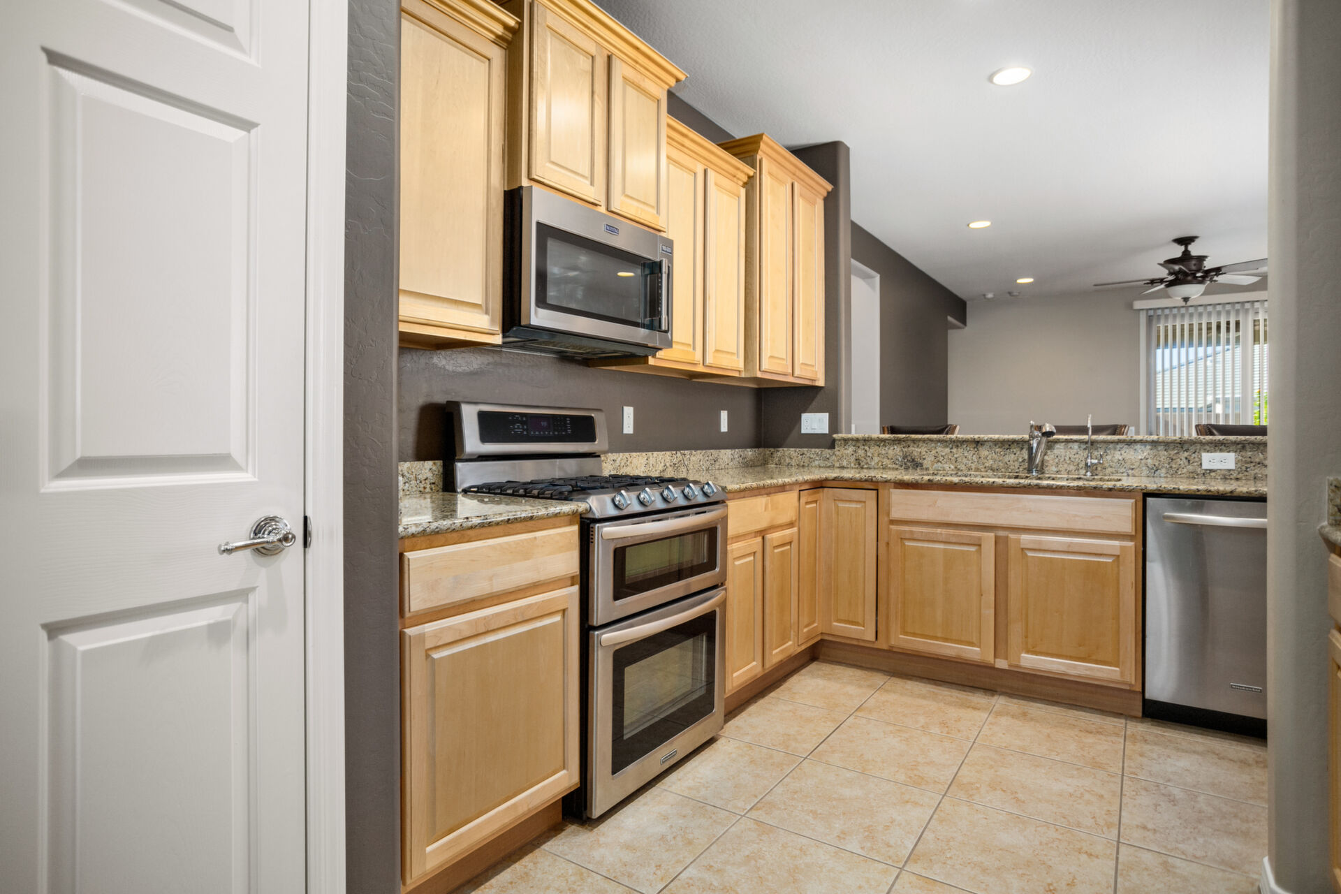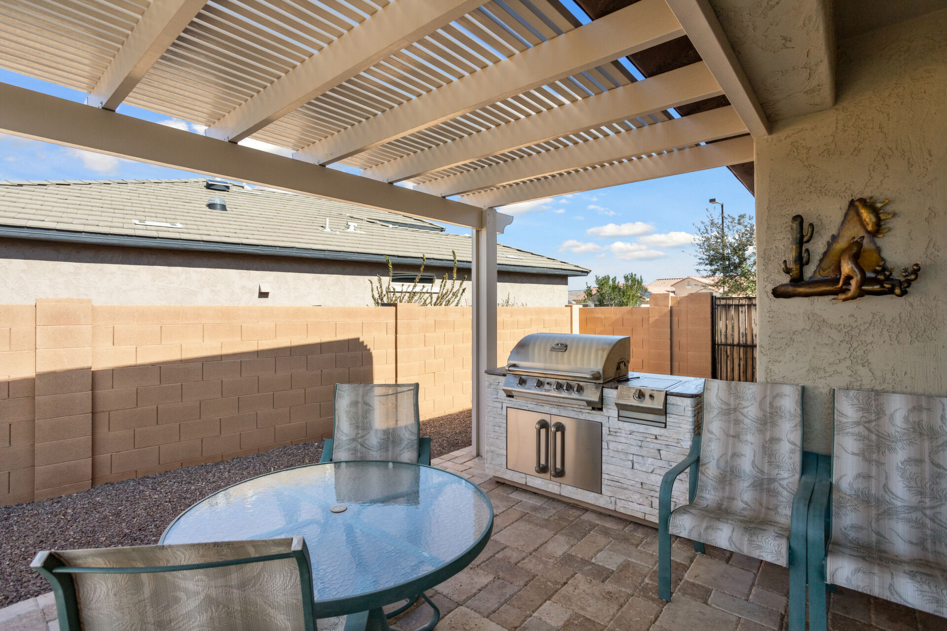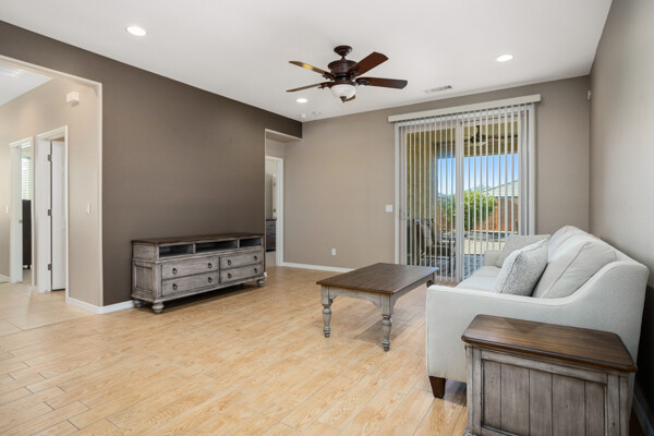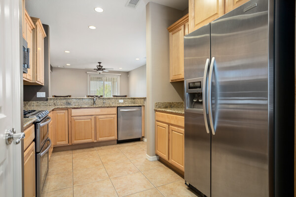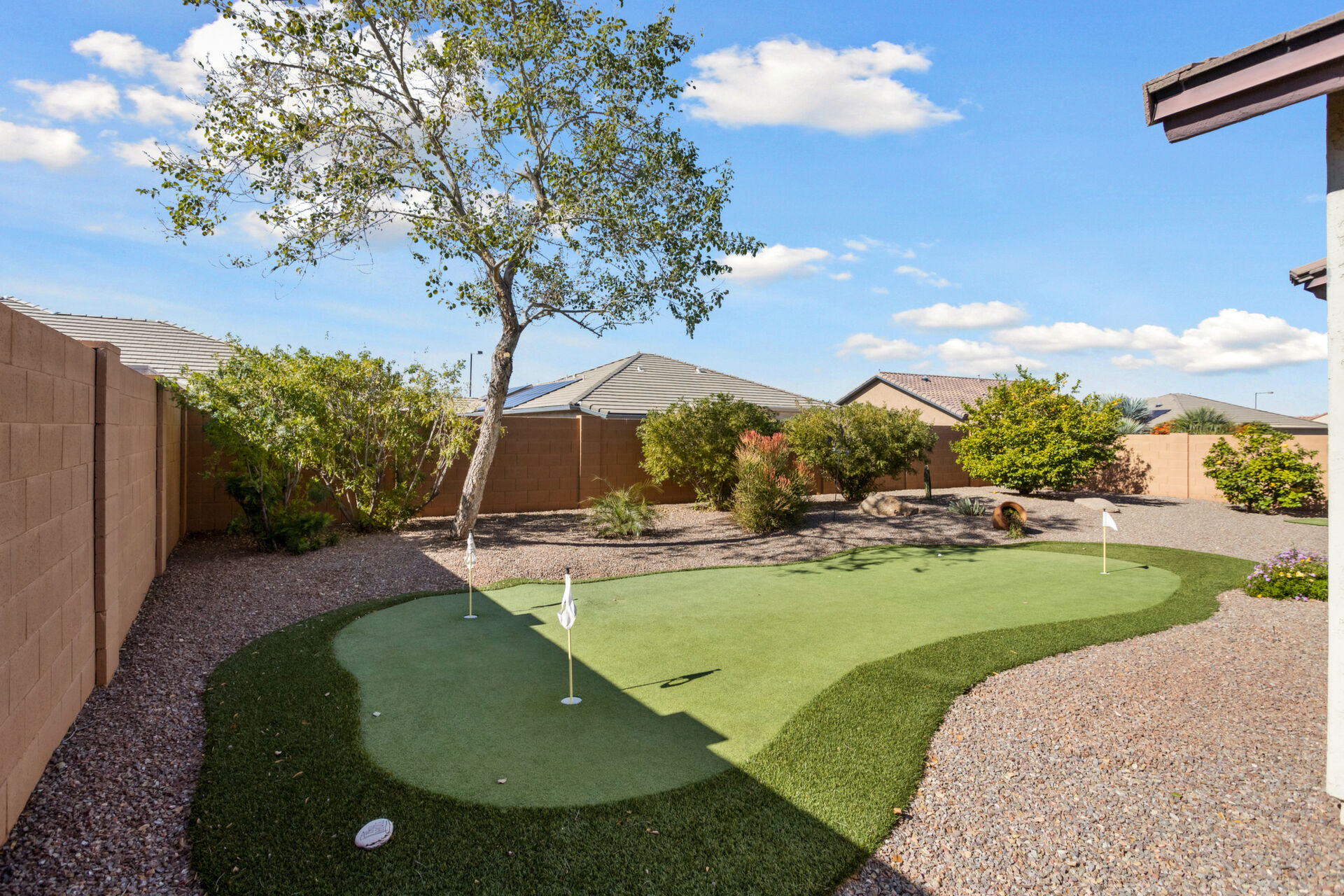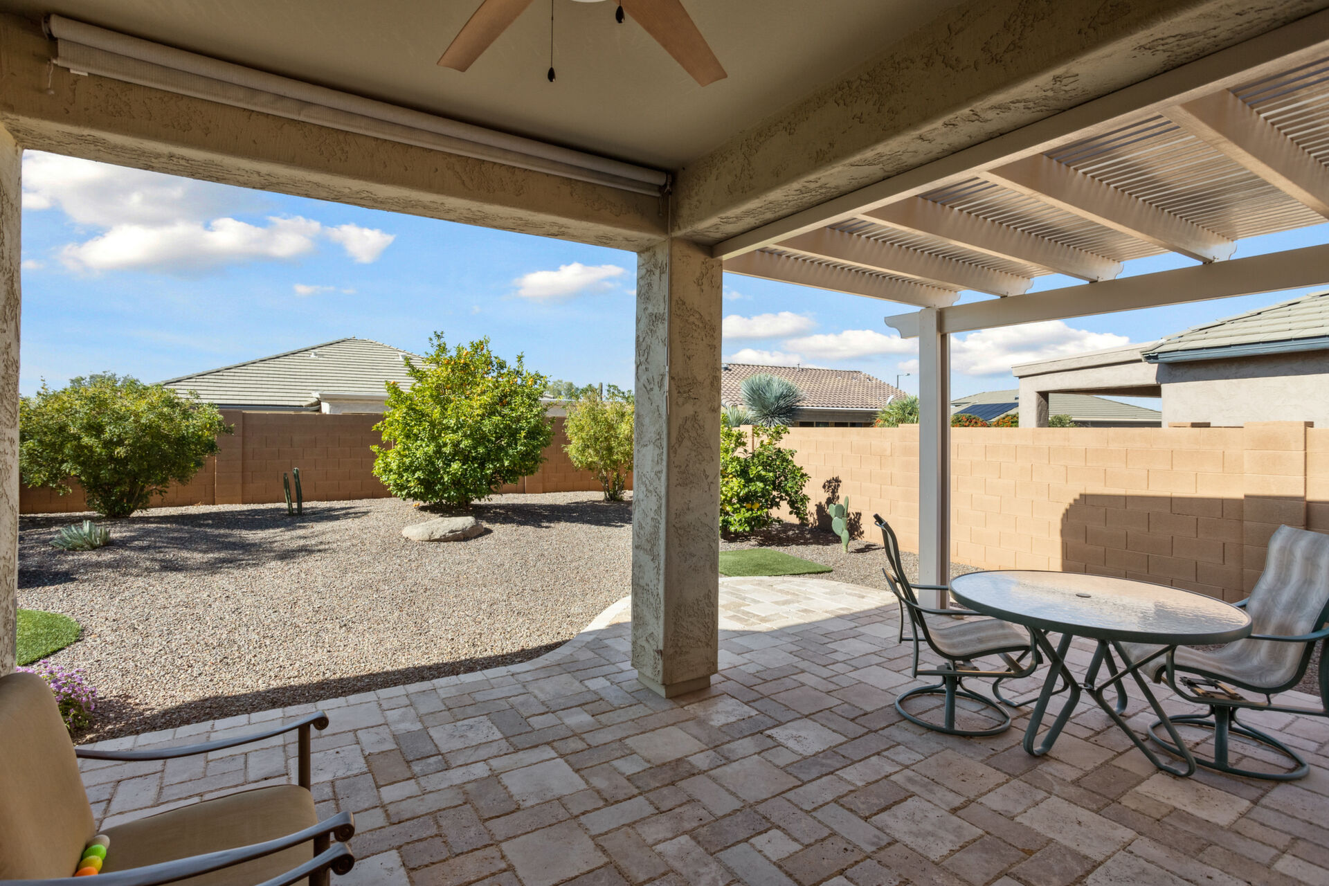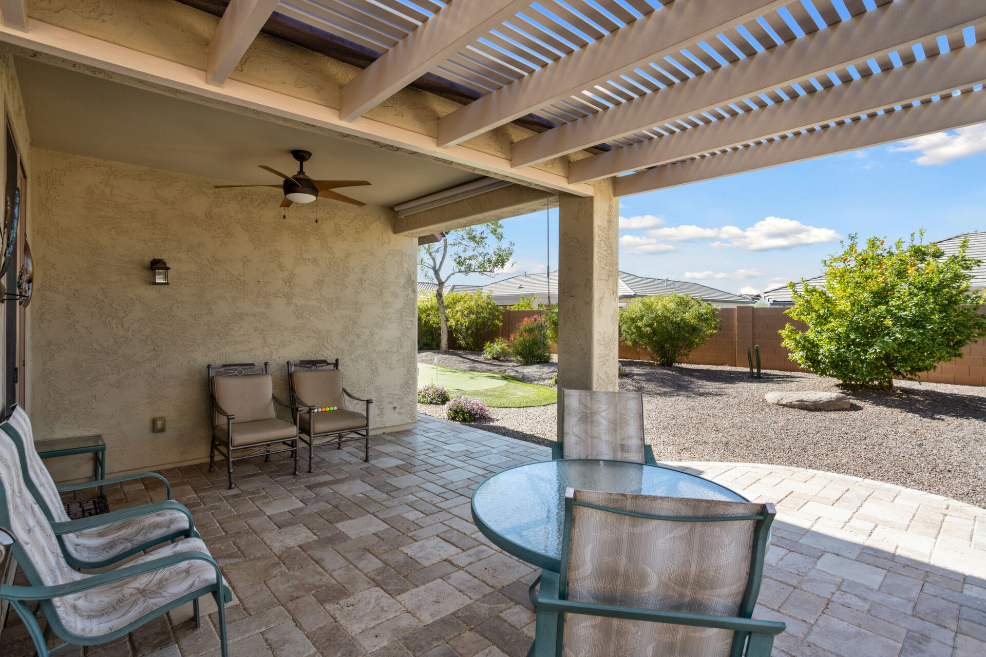 CHARMING UPDATED SPIRIT MODEL. Notice the curb appeal when you arrive. Enter the generous gathering space with backyard access. The dine-in kitchen features upgraded SS appliances, staggered cabinets with pull-outs, upgraded gas stove, RO, granite countertops & breakfast bar. Tile flooring in all the right places & ceiling fans throughout. Large owners suite & bath w/dual sinks, step in shower and walk in closet. The den can be used for guests, hobbies or office space. Enjoy outdoor living on your extended pergola covered patio with custom travertine tile, overlooking your beautifully landscaped yard with putting green in your private, walled back yard. All this located on this quiet friendly street just steps from all the amenities. THIS IS A MUST SEE!