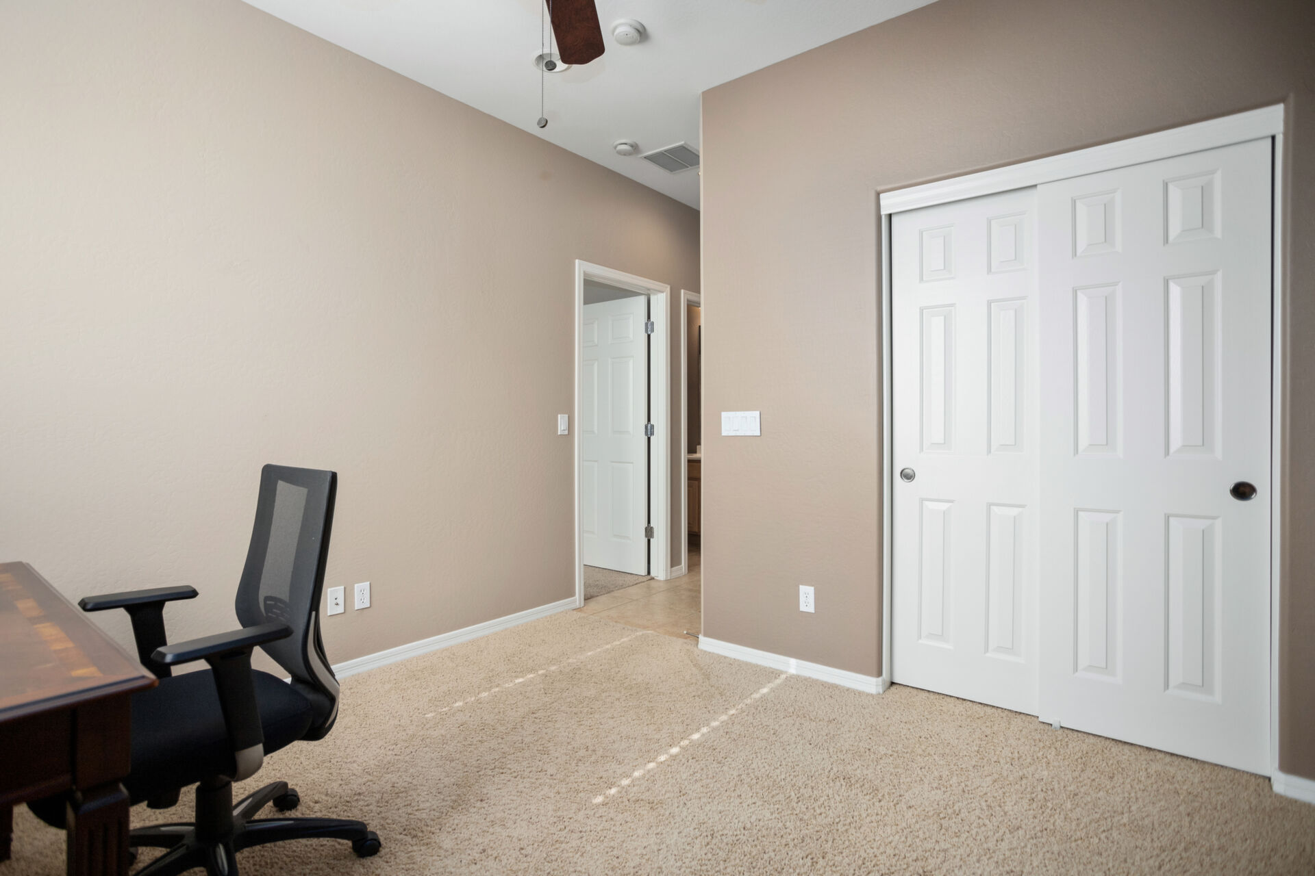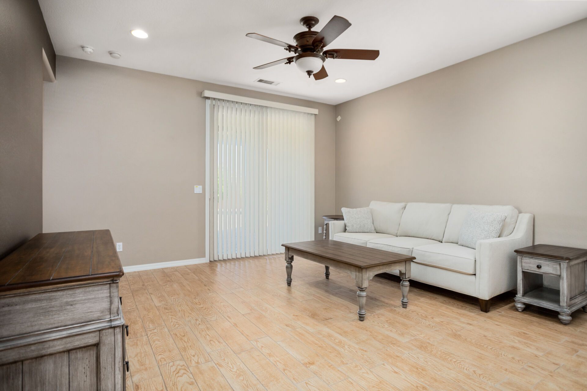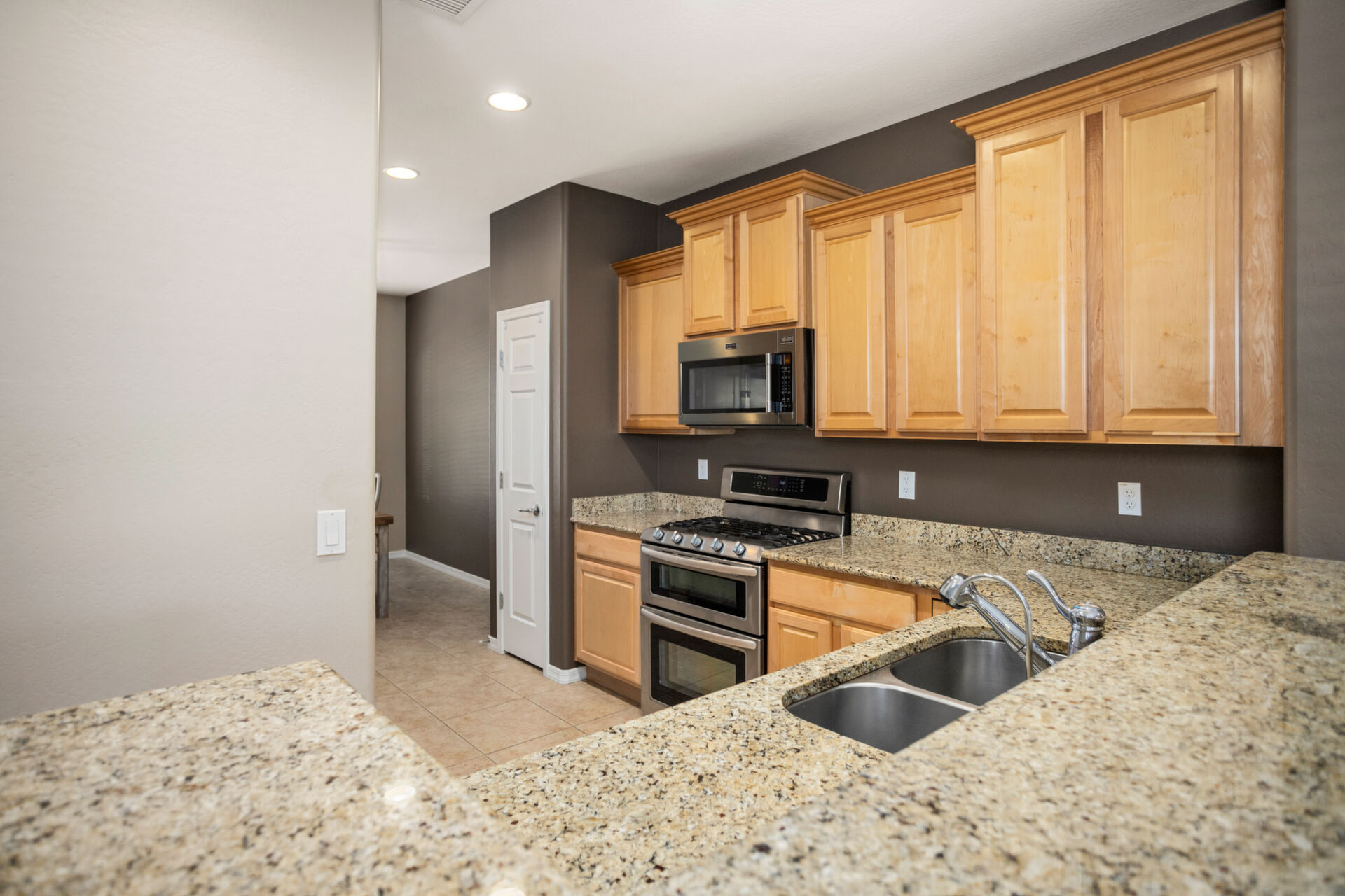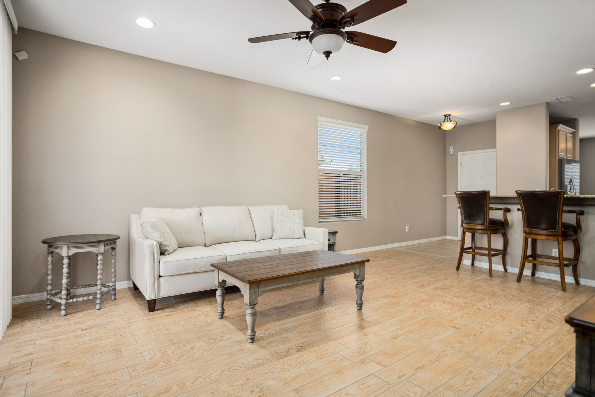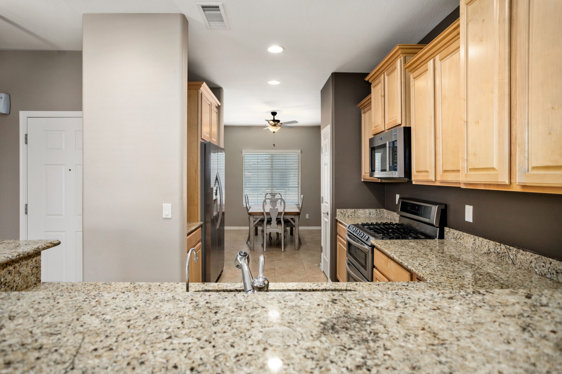 CHARMING UPDATED SPIRIT MODEL. Notice the curb appeal when you arrive. Enter the generous gathering space with backyard access. The dine-in kitchen features upgraded SS appliances, staggered cabinets with pull-outs, upgraded gas stove, RO, granite countertops & breakfast bar. Tile flooring in all the right places & ceiling fans throughout. Large owners suite & bath w/dual sinks, step in shower and walk in closet. The den can be used for guests, hobbies or office space. Enjoy outdoor living on your extended pergola covered patio with custom travertine tile, overlooking your beautifully landscaped yard with putting green in your private, walled back yard. All this located on this quiet friendly street just steps from all the amenities. THIS IS A MUST SEE!